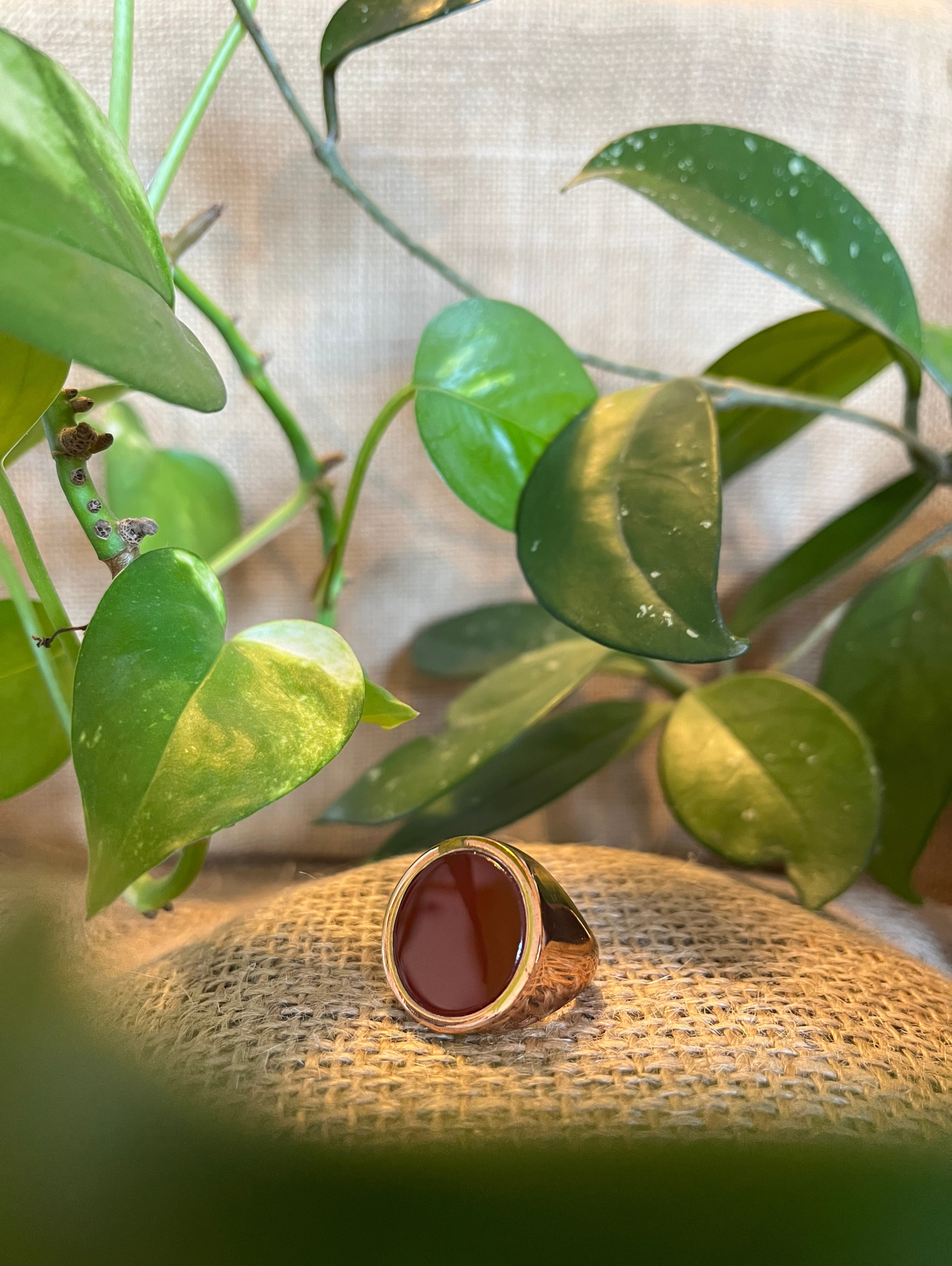 - Design: Pietra corniola naturale incastonata in un castone in bronzo.